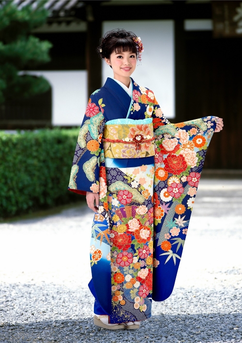 ヨーロッパの陶磁器を思わせる上品で華やかなバラ柄の袴用着物です。ピンクの袴で鮮やかコーデ。