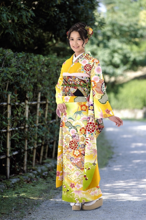 袴用着物には珍しい正絹の着物です。上品な和の色彩で染めた桜の花には部分的に金糸の刺繍が施され高級感のある逸品です。